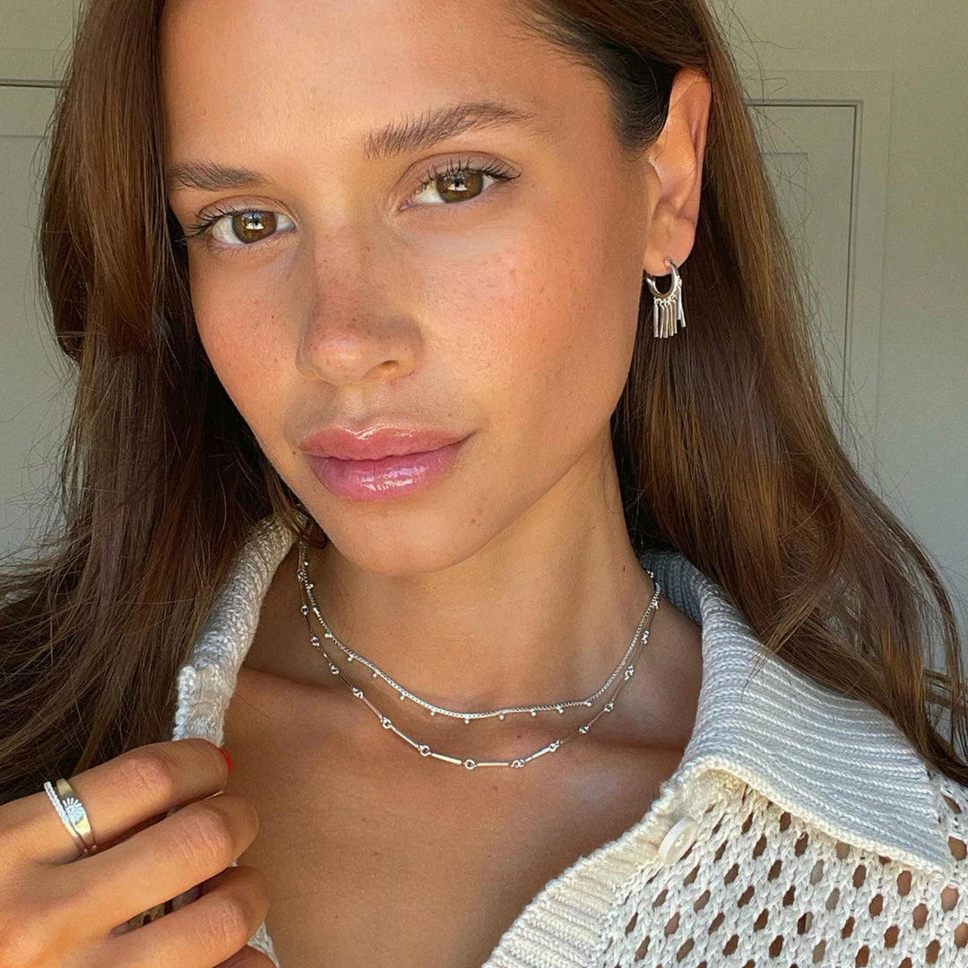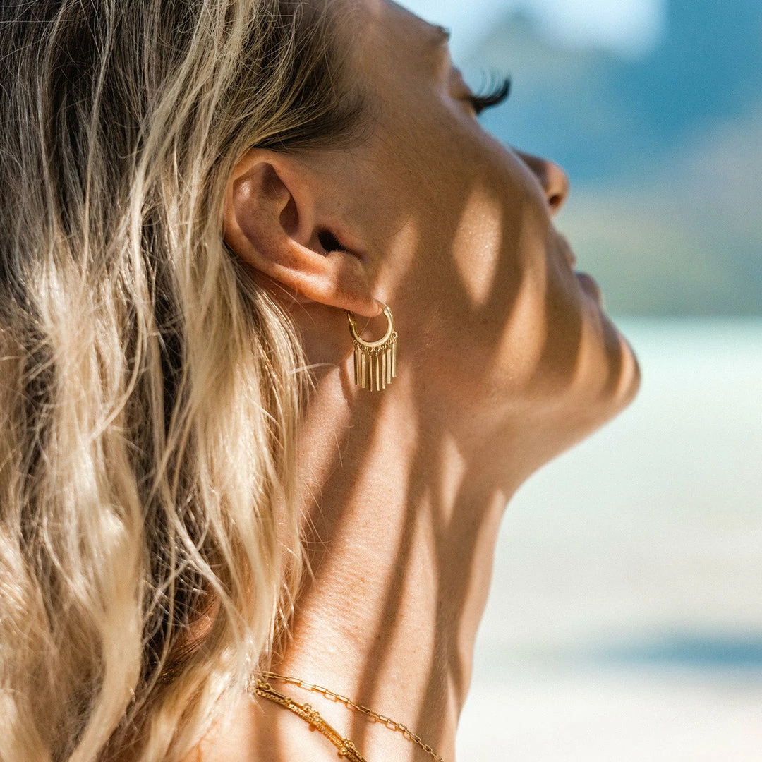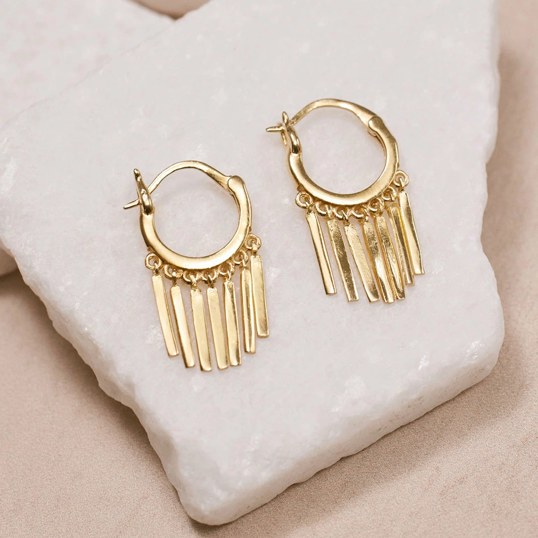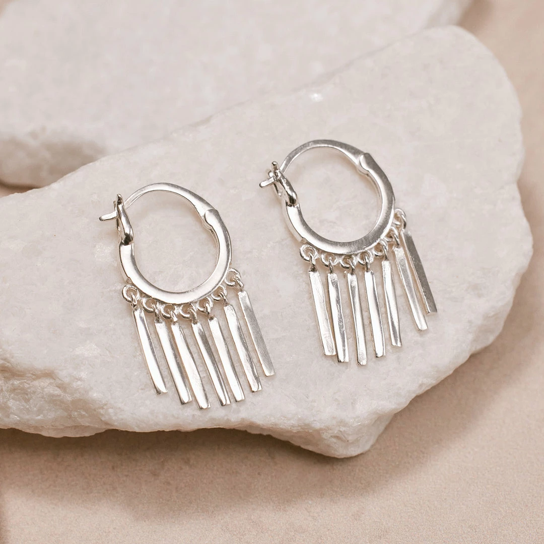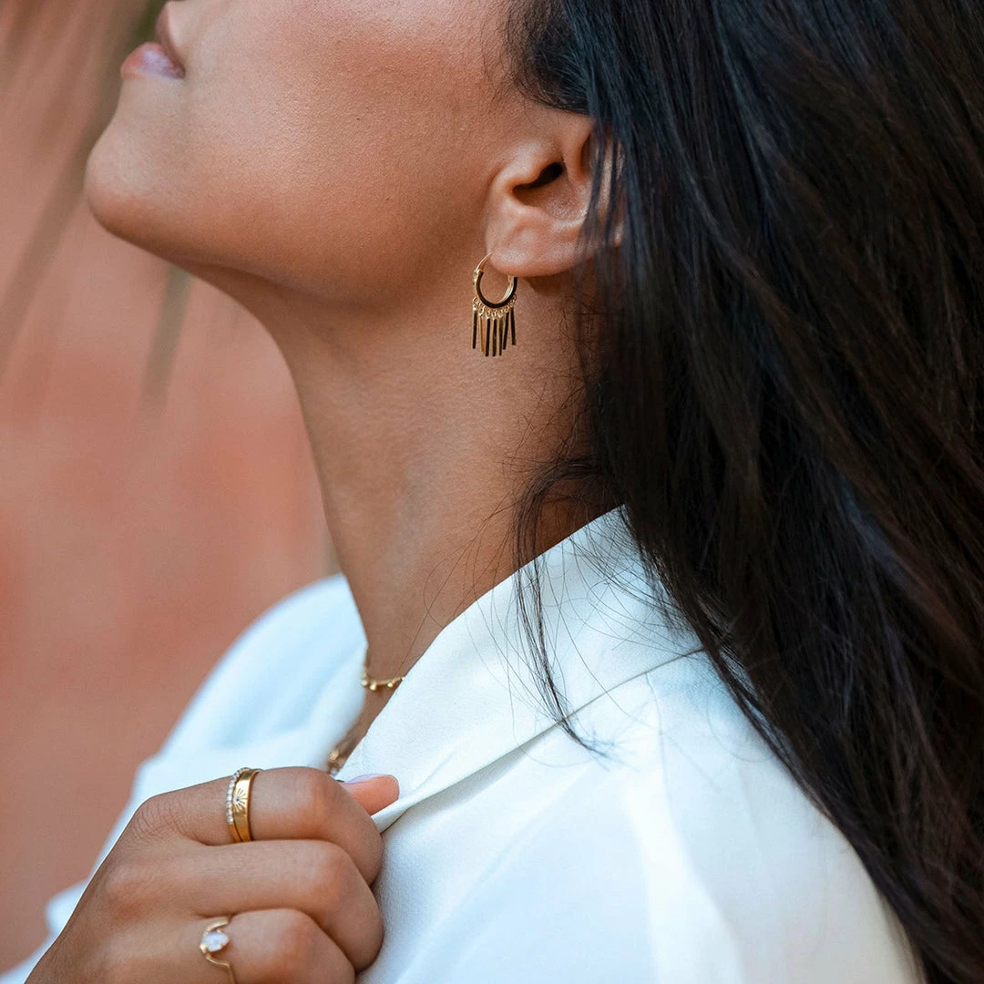 Bohemian meets sophisticated with these Fringe Huggies, featuring a mini hoop with metal fringe pieces layered across the piece – perfect for adding some flare to your look!