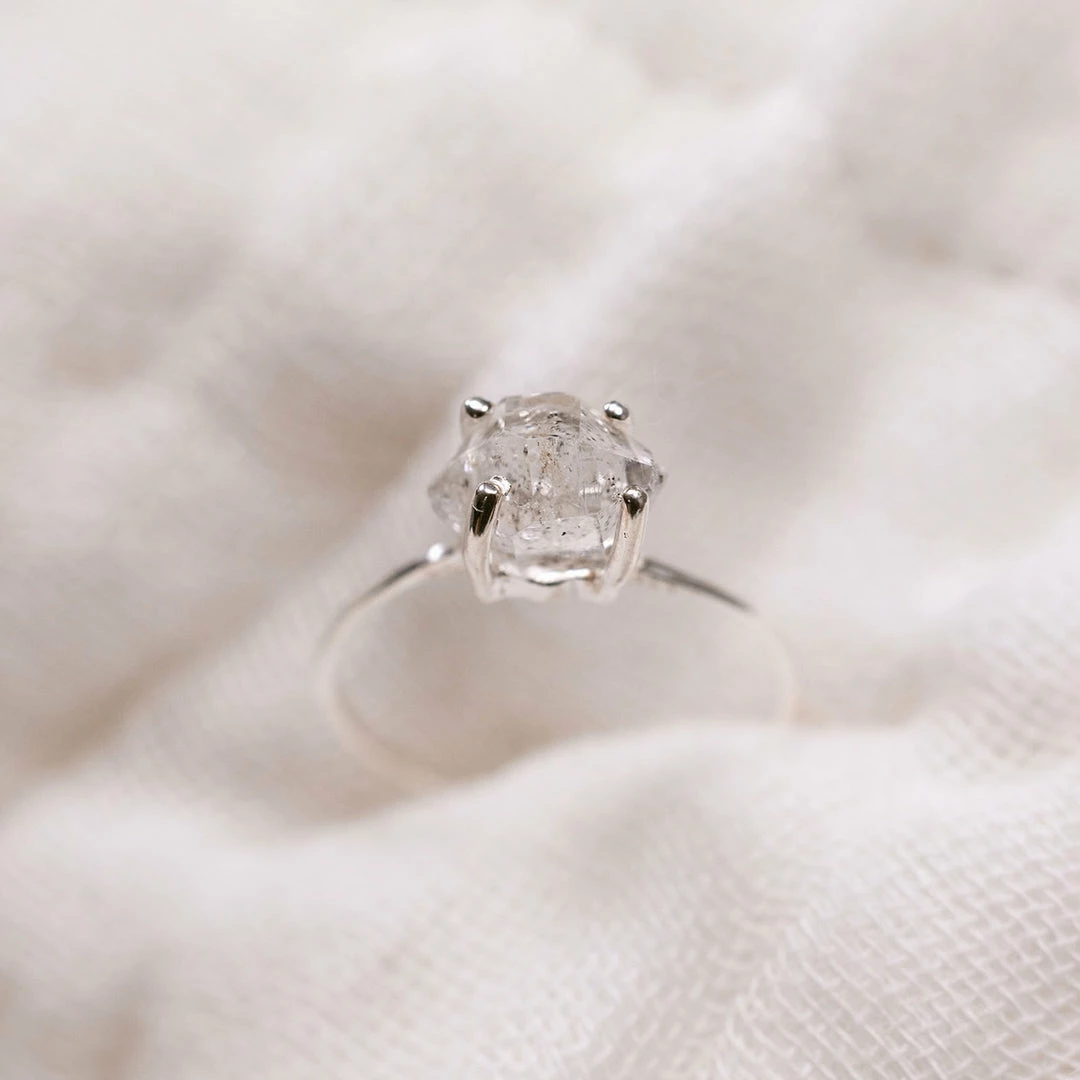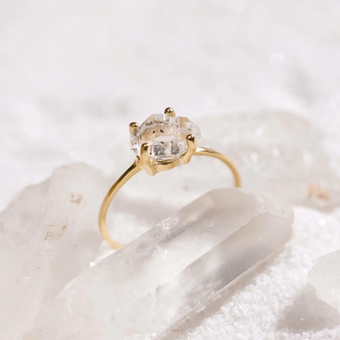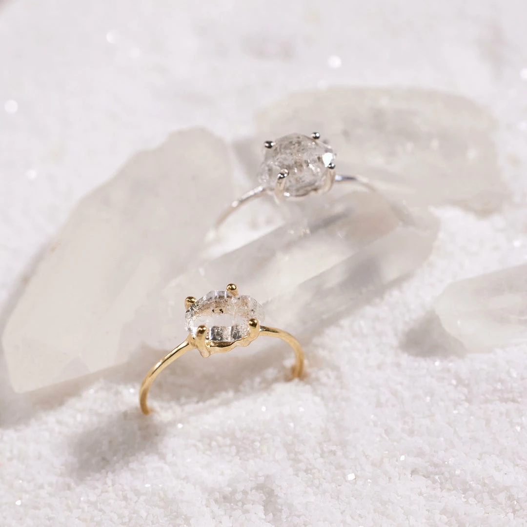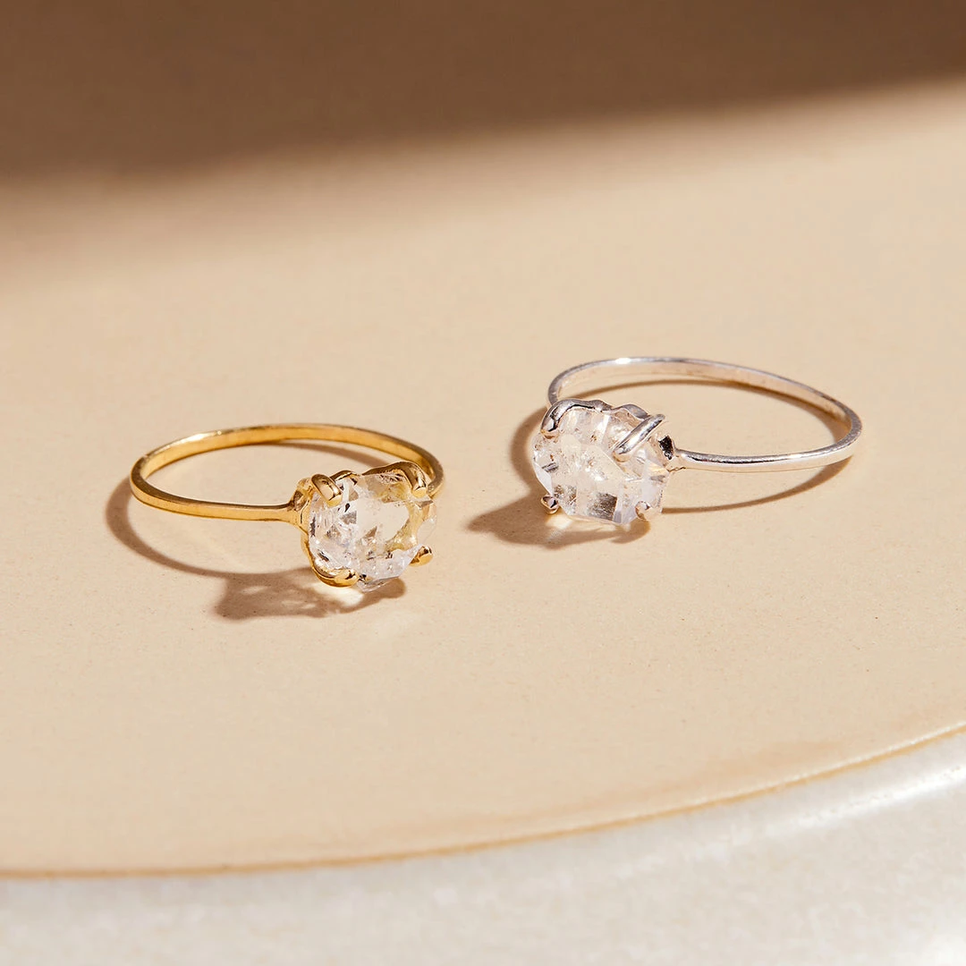 Leave your mark with this ever-so-dainty Herkimer Ring. Made up of a thin band in sterling silver orΒ 18K gold plating, this style featuresΒ aΒ natural Herkimer Diamond stone set in the centerΒ that will make your fingers sparkle.