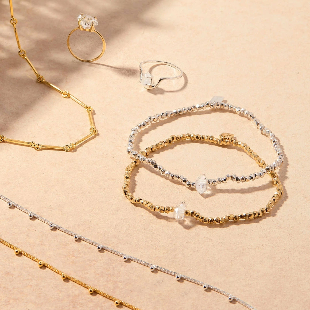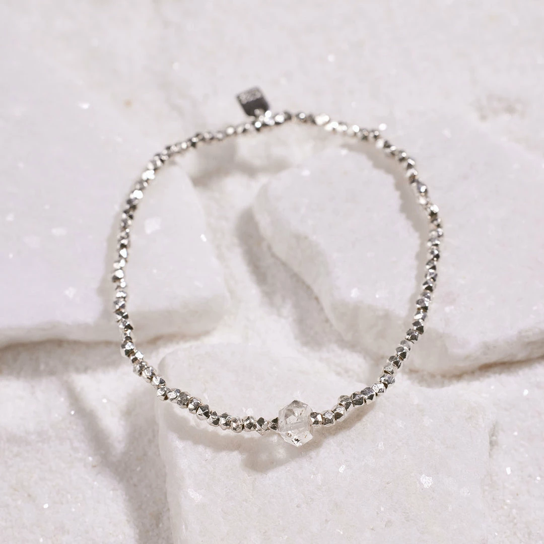 Like the first glimmer of dusk on a crisp fall evening, the Herkimer Stretch Bead Bracelet is something youβll never forget about. This piece is made up of sterling silver orΒ 18K gold plating ball beads, and features aΒ naturalΒ Herkimer Diamond bead in the center for a look to remember.