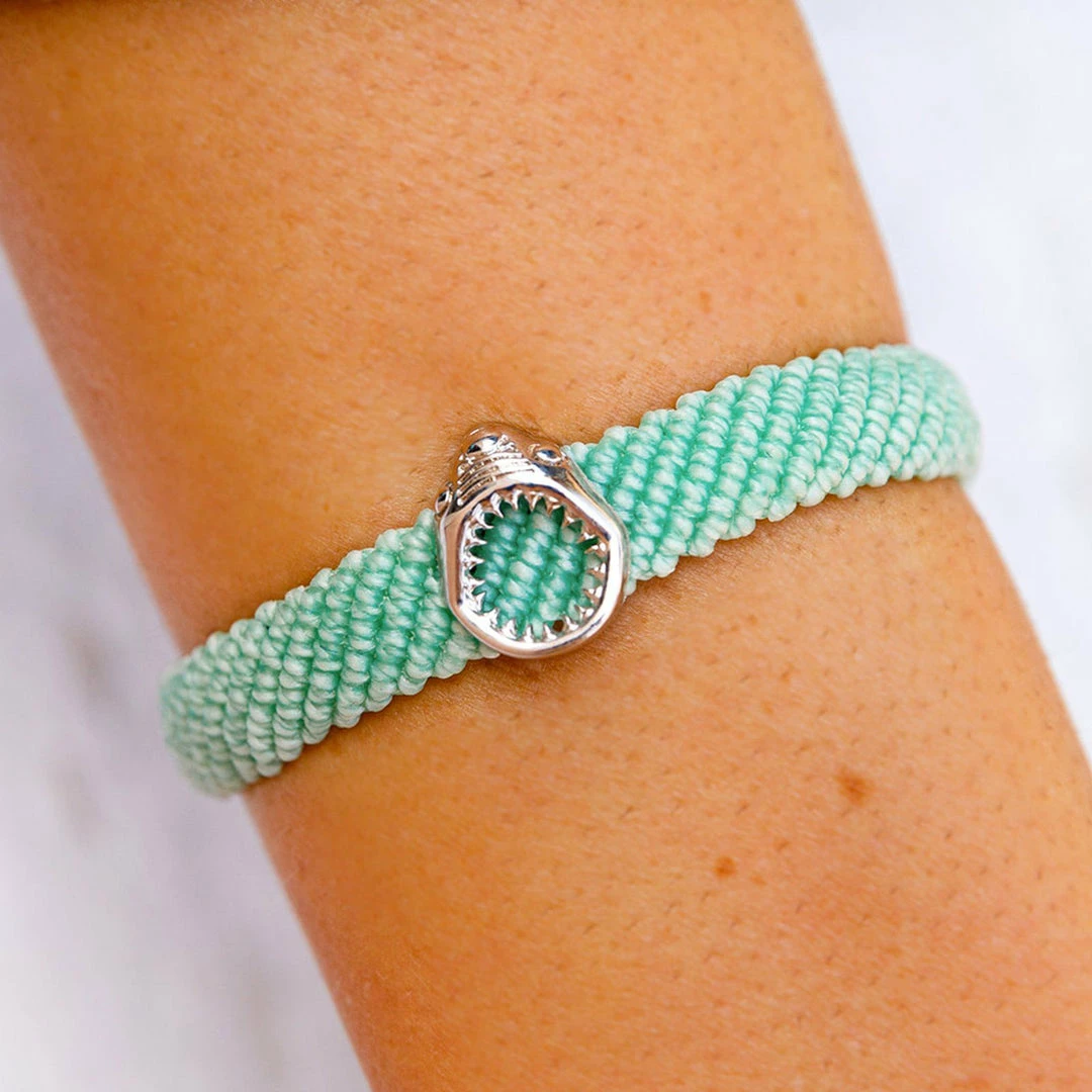 This bracelet is a great conversation starter! The shark jaw design is unique and well-crafted. The flat woven material feels durable and comfortable to wear. Perfect for casual outings or beach trips. Highly recommend!