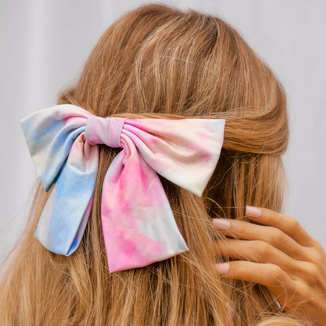 Barrettes are back and they are *big*! The Tie Dye Bow Barrette comes in a soft stretchy fabric painted in a pretty pastel tie dye attached to a silver french barrette. Talk about the perfect statement piece!