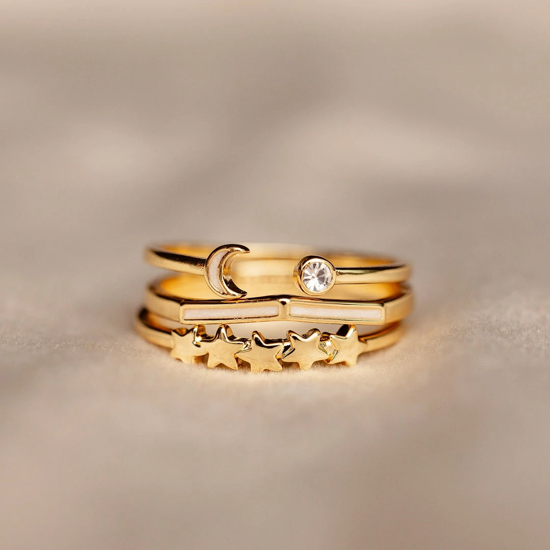 The stars have aligned to bring you the super elegant Crescent Stars Ring Stack, available in silver or gold! This set features 3 rings, wearable separately or as a star-studded stack.