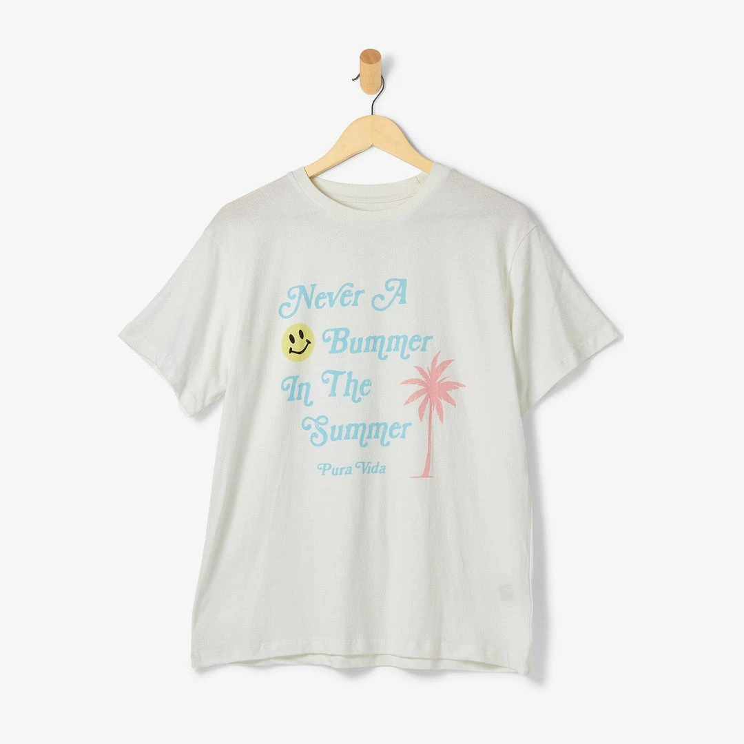 Because warm weather = no worries! Our Never a Bummer in the Summer Tee features a pretty pink palm tree and vintage blue lettering, with a bright smiley face to bring even more good vibes.