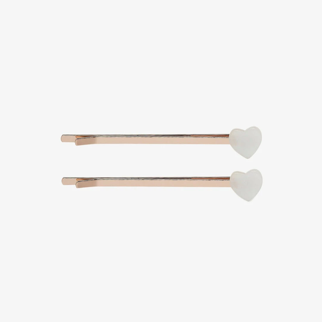 Add a girly touch to any outfit with our Pearlized Heart Hair Pins. This two pack comes with rose gold pins and shimmering pearl hearts that give you an elegant look that will transcend time.
