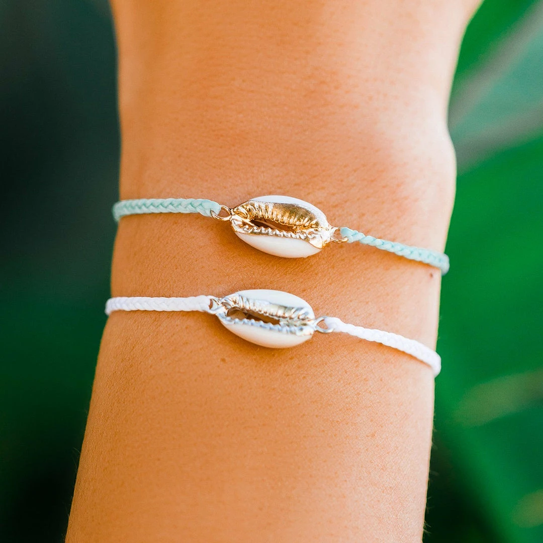 Luxe meets the sandy shores with the Costa Cowrie Charm Bracelet! Sitting on a white bitty braid, each bracelet features a cowrie shell with the edges dipped in silver making them a real hidden treasure!