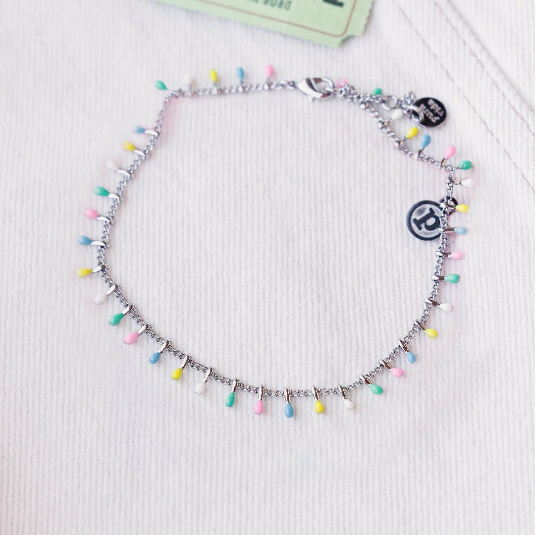 Color us obsessed with the Enamel Droplet Chain Anklet! This silver style features a string of enamel-dipped charms in bold colors thatβll brighten up your summer ensembles.
