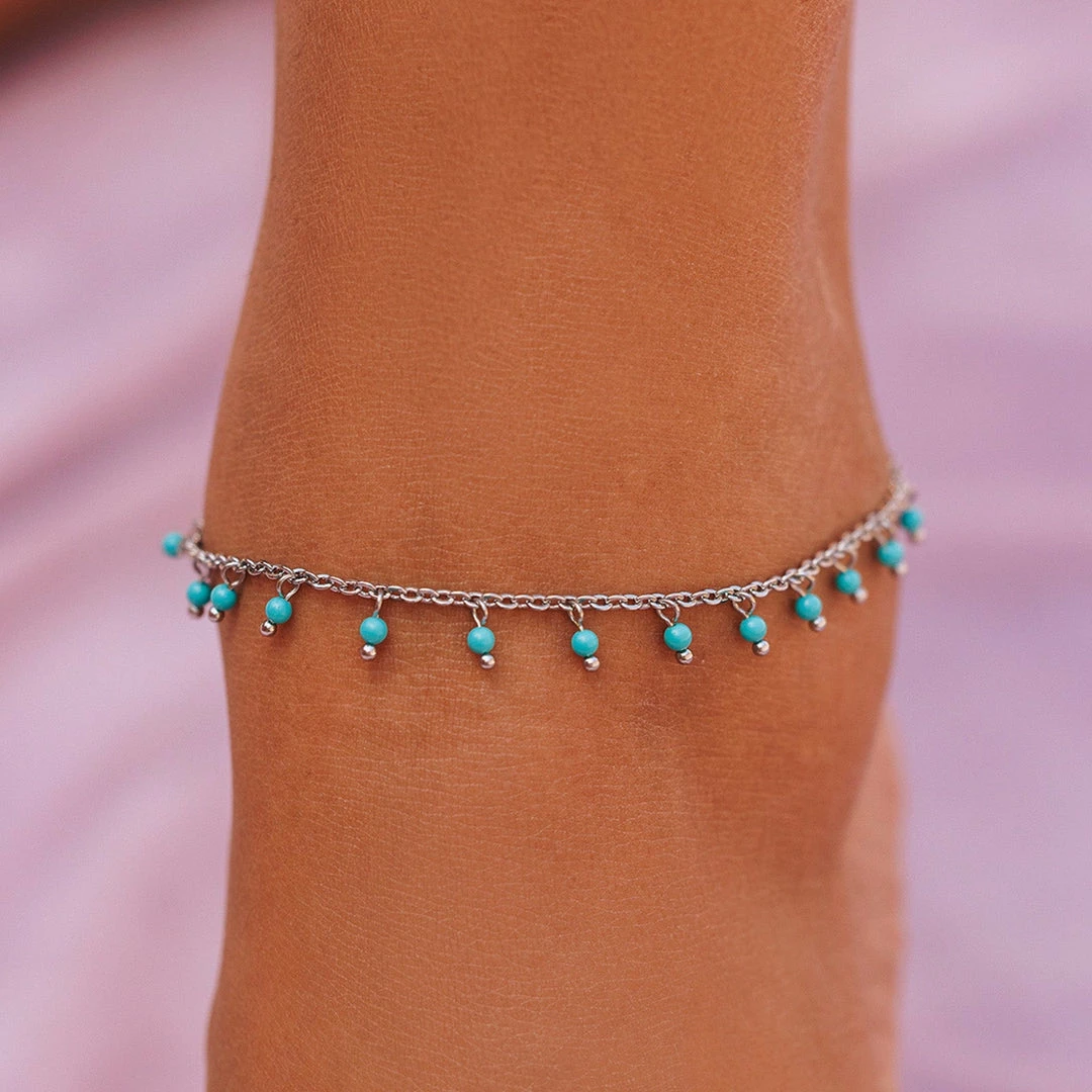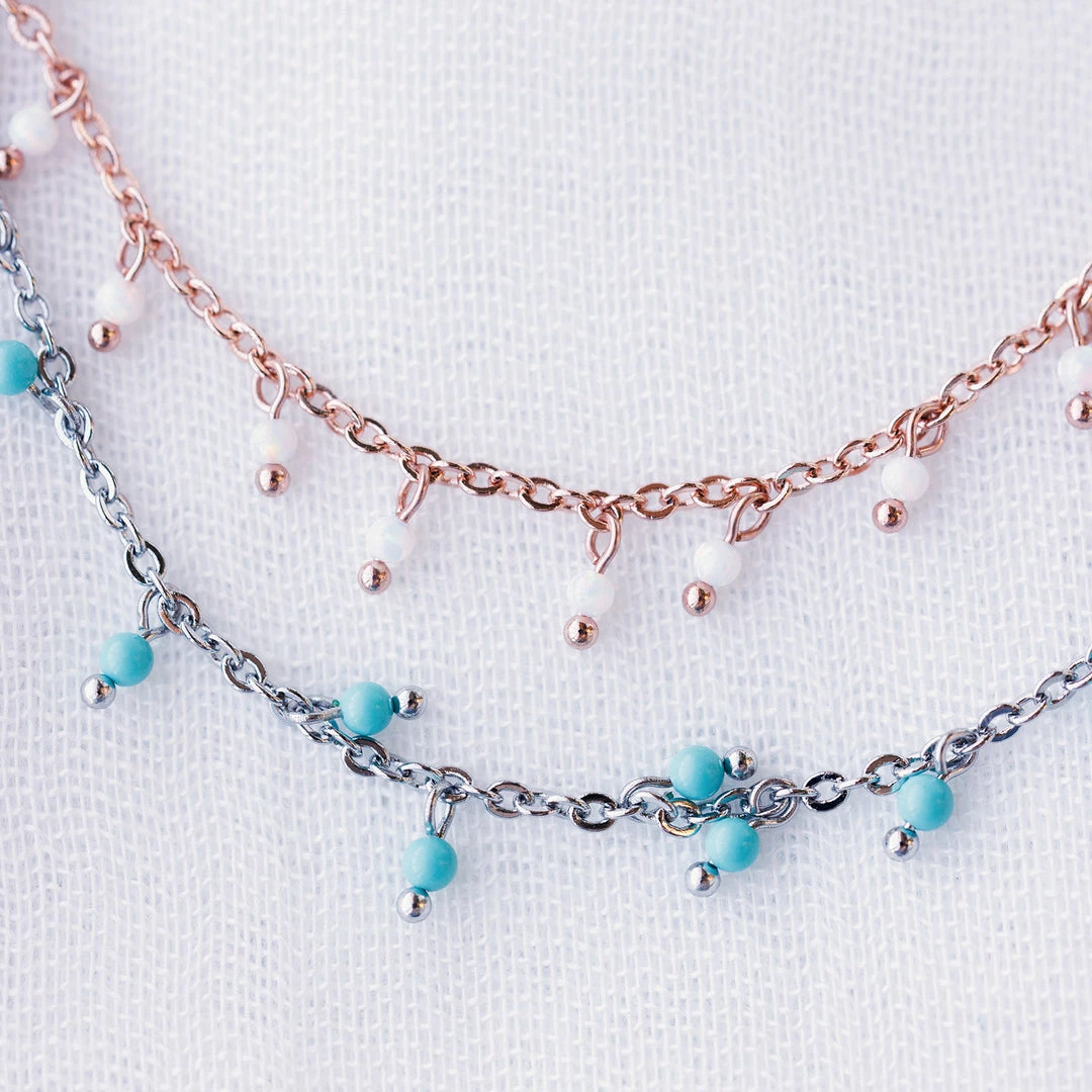 Boho babes, this one’s for our! Our Floating Gemstone Anklet is available in two summer color combos—turquoise and silver or opal and rose gold—for a beaded design that stands out with any outfit.