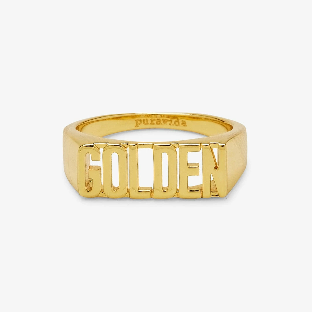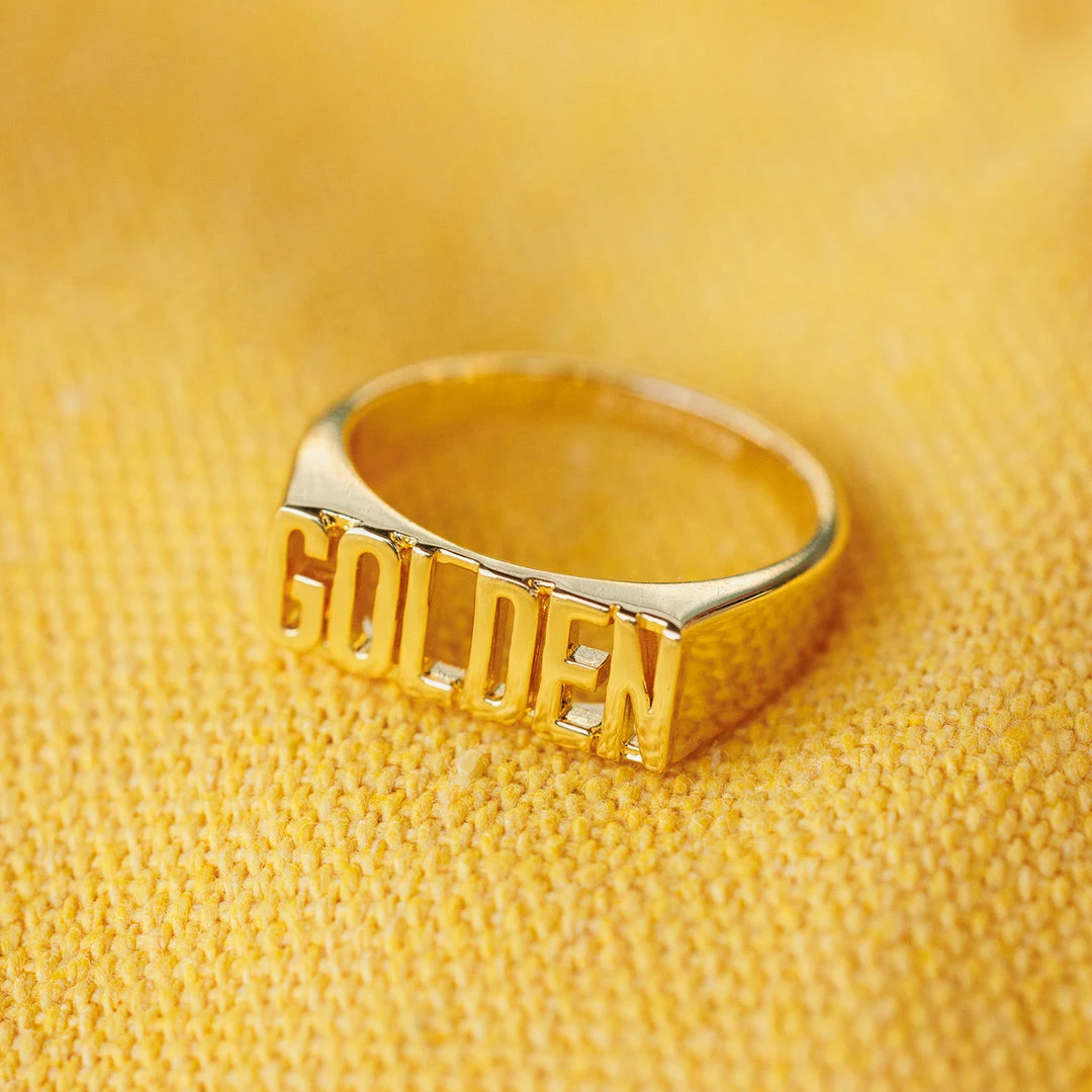 Get in a sunshine state of mind with our Golden Signet Ring. This bold design features chunky letters across the top, and will spell out exactly the vibe youβre going for all summer long.