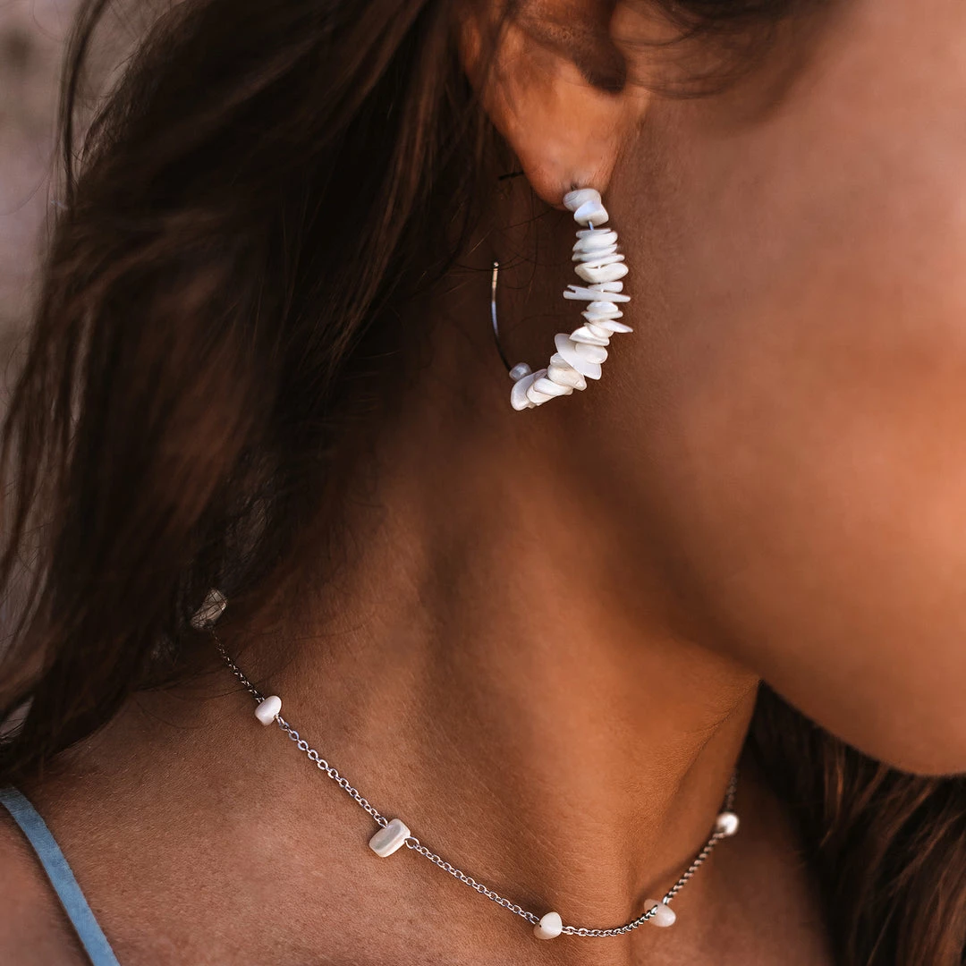 Shimmer like the star you are in our Mother of Pearl Chip Hoop Earrings. This silver open-hoop style features a strand of Mother of Pearl shell chips that are 100% natural and totally genuine (so no two pairs look alike!).