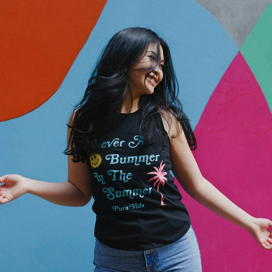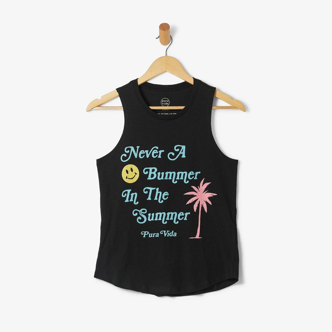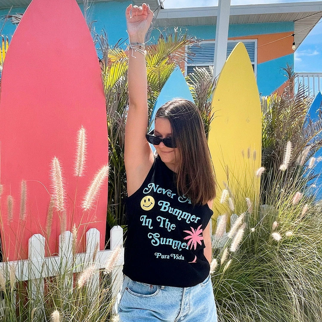 Nothinβ can get you down when wearing our Never a Bummer in the Summer Tank. This sleeveless style features a pretty pink palm tree and vintage blue lettering, with a bright smiley face to bring even more good vibes.