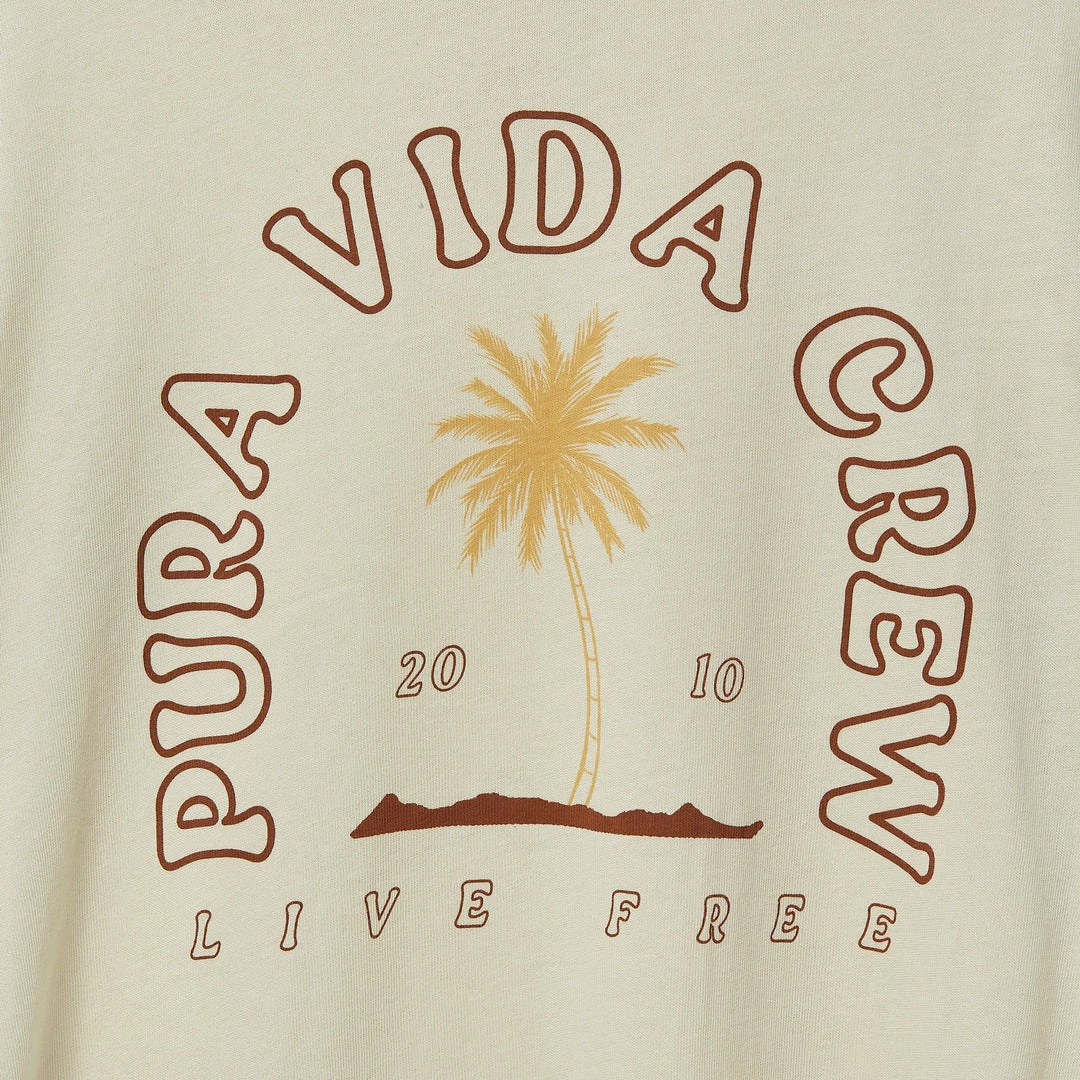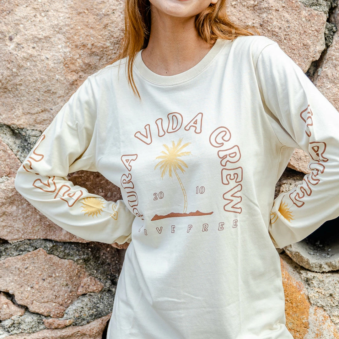 Slow down and kick back with the Pura Vida Palm Long Sleeved Crew Tee in the color Dune! This classic piece gives major California-casual vibes, and features a palm tree motif with the words “Pura Vida Crew, Live Free” on the front, and “Live Free” on the sleeves.