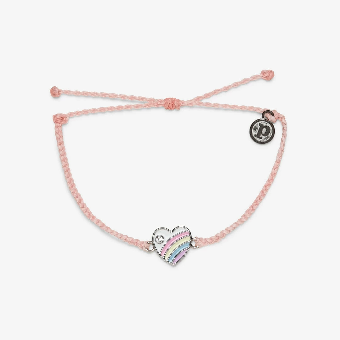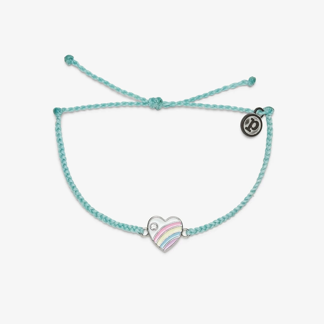 Weβre throwinβ it back to β70s style with our Pastel Vintage Heart Charm Bracelet. Available in shades of seafoam green or baby pink, this bitty braid style features an enameled rainbow heart charm, with a tiny glass stone for a hint of sparkle.