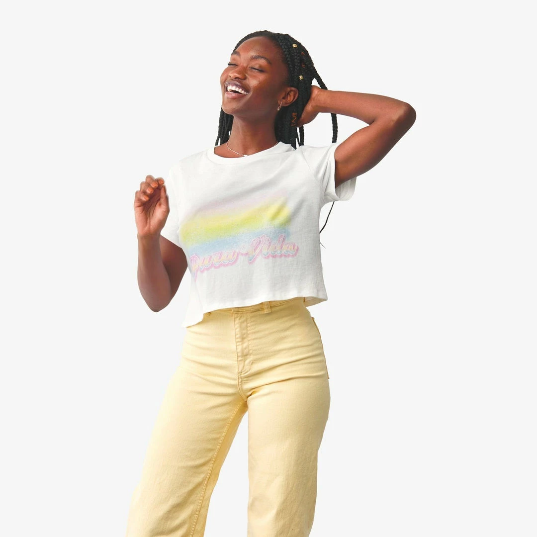 It doesnβt get any groovier than our Pura Vida Rainbow Crop Tee. In a fresh white hue with pastel accents, this β70s-inspired style gives any outfit a throwback feel (and looks like a super-cool vintage tee, even though itβs brand new!).