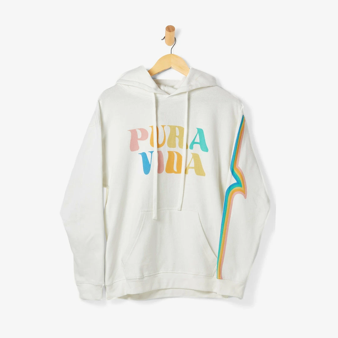 Psychedelic is sooo in style, thanks to our Pura Vida Rainbow Wave Hoodie. This β70s-inspired piece features a multihued Pura Vida logo in a far-out font, plus our classic wave design that runs down the left sleeve.