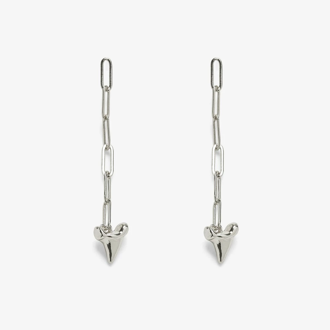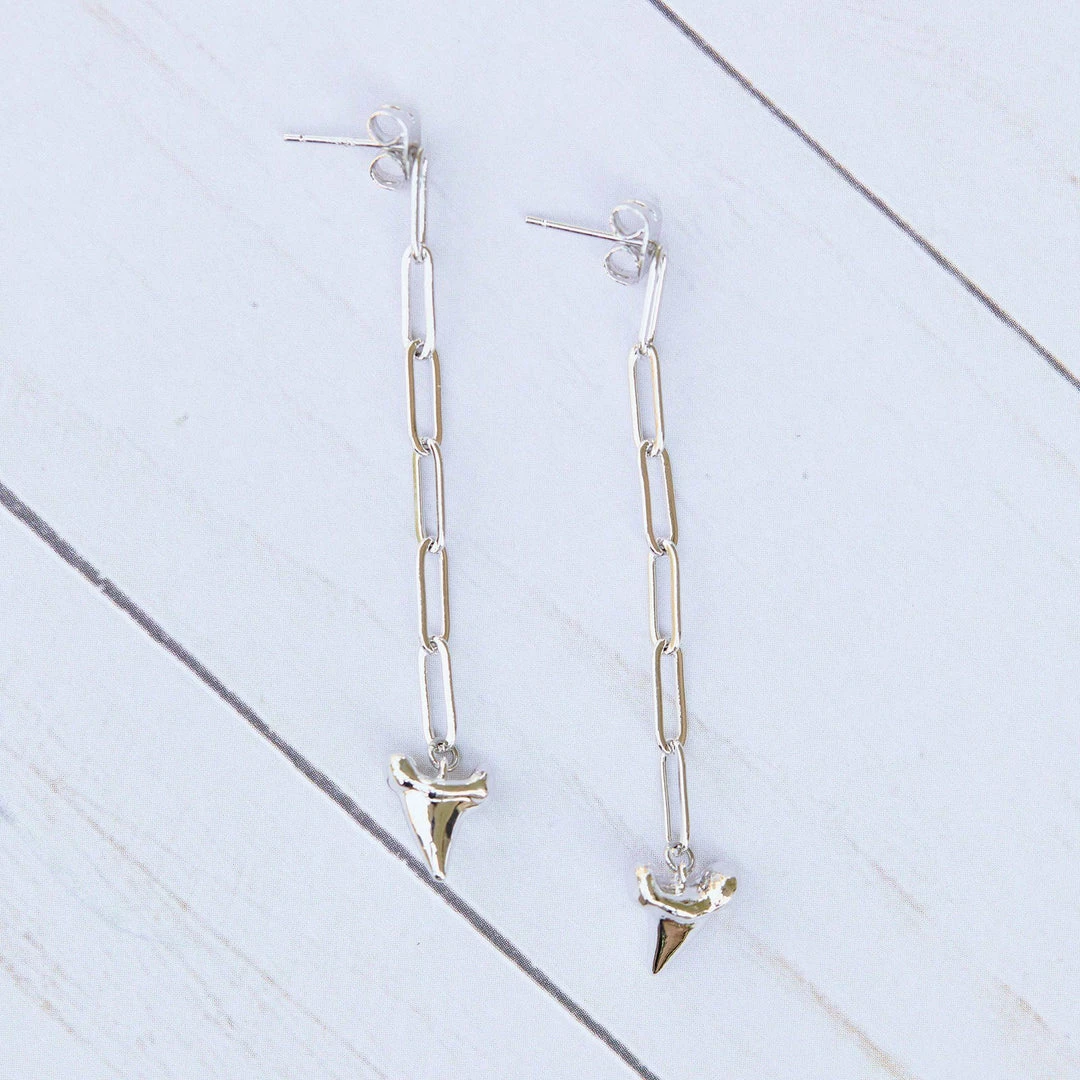Add some edge to your seaside style with our Shark Tooth Chain Earrings. In a sleek silver finish, this dangly pair features paper-link chain detailing and a bitty shark tooth charm. Match it back to our Shark Tooth Bracelet for the ideal beach-day look.