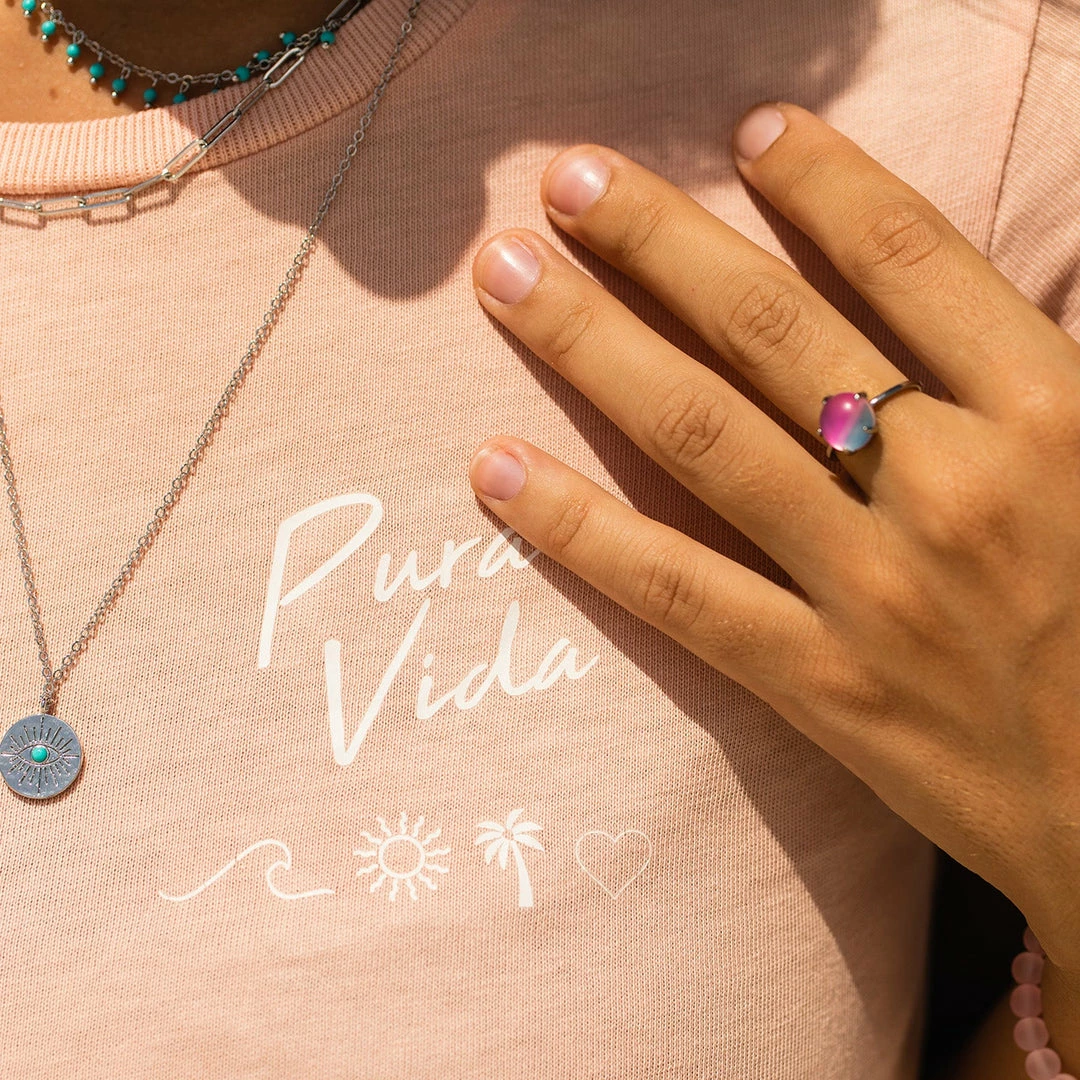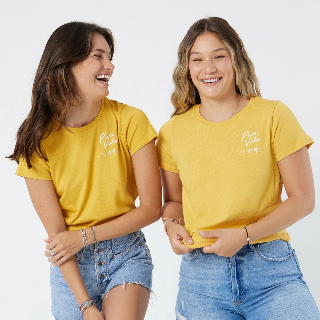 Master the casual-cool look in our Summer Vibes Fitted Tee. In a body-skimming silhouette, this simple style comes in shades of pink or blue, with a Pura Vida script logo and summer graphics on the chest.