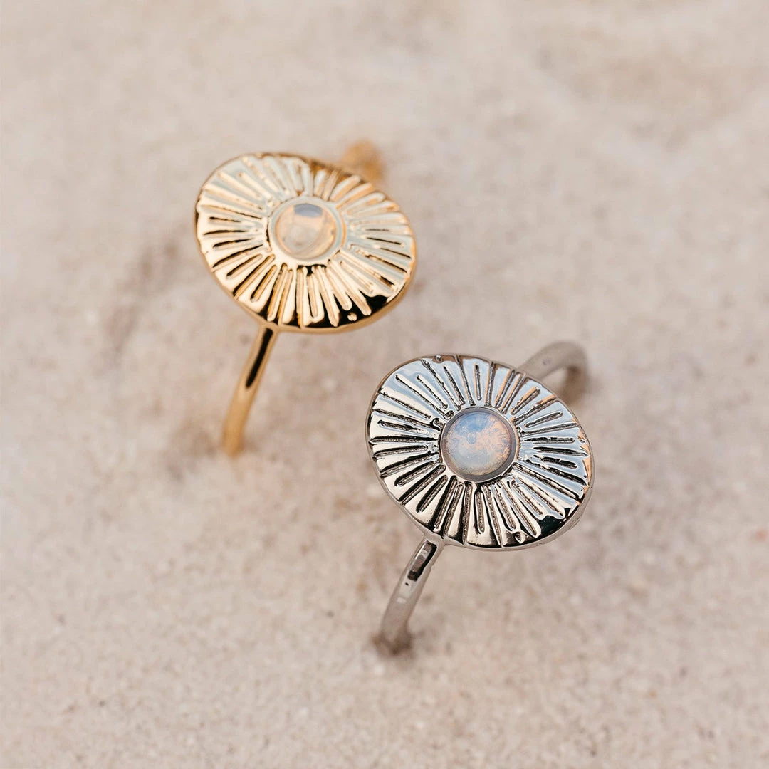 Whether you’re swimming in the ocean or hanging on the beach, the Sun Ray Ring is sure to give you all the sunny vibes! This super chic ringΒ comes in a silver or gold finish and featuresΒ a sun motif with a shiny moonstone in the center.