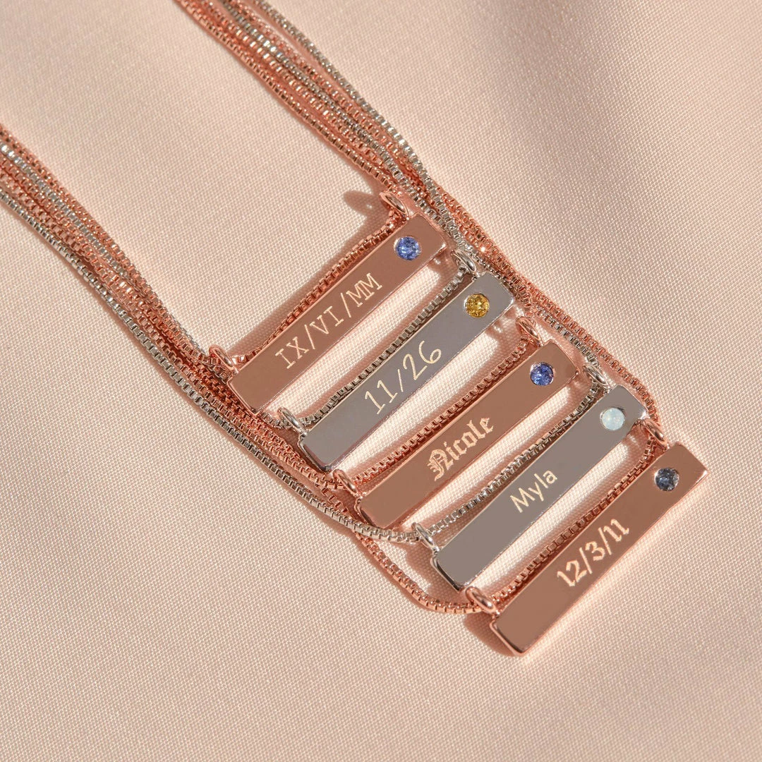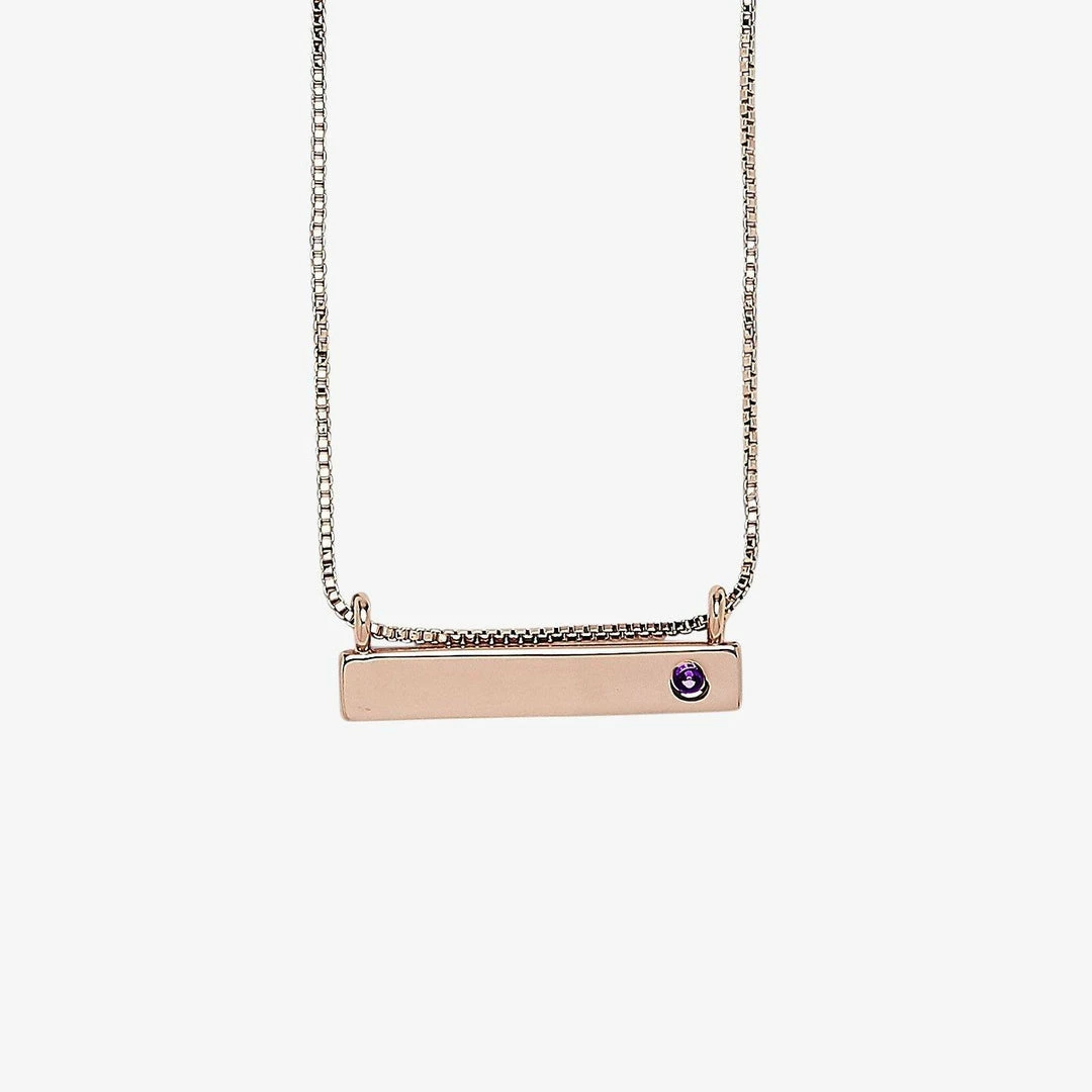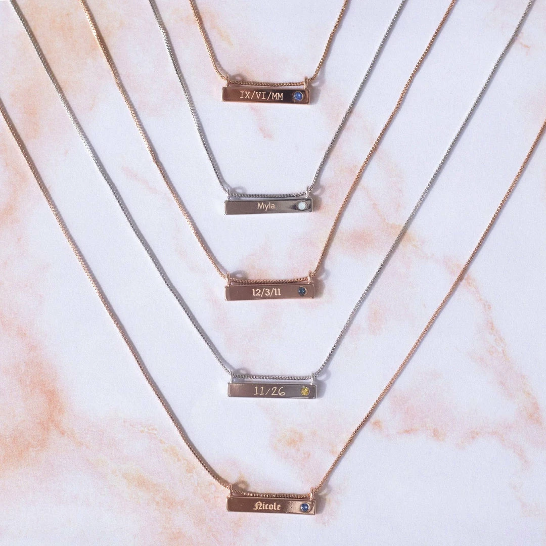 One way to make your favorite PV piece even more special? By customizing it with your own message! Our Engravable Birthstone Necklace comes in two finishes—silver and rose gold—with a chic bar shape and a tiny crystal accent for your birthstone! Plus, you can personalize it with your name, an important date, a funny saying or cute symbols.