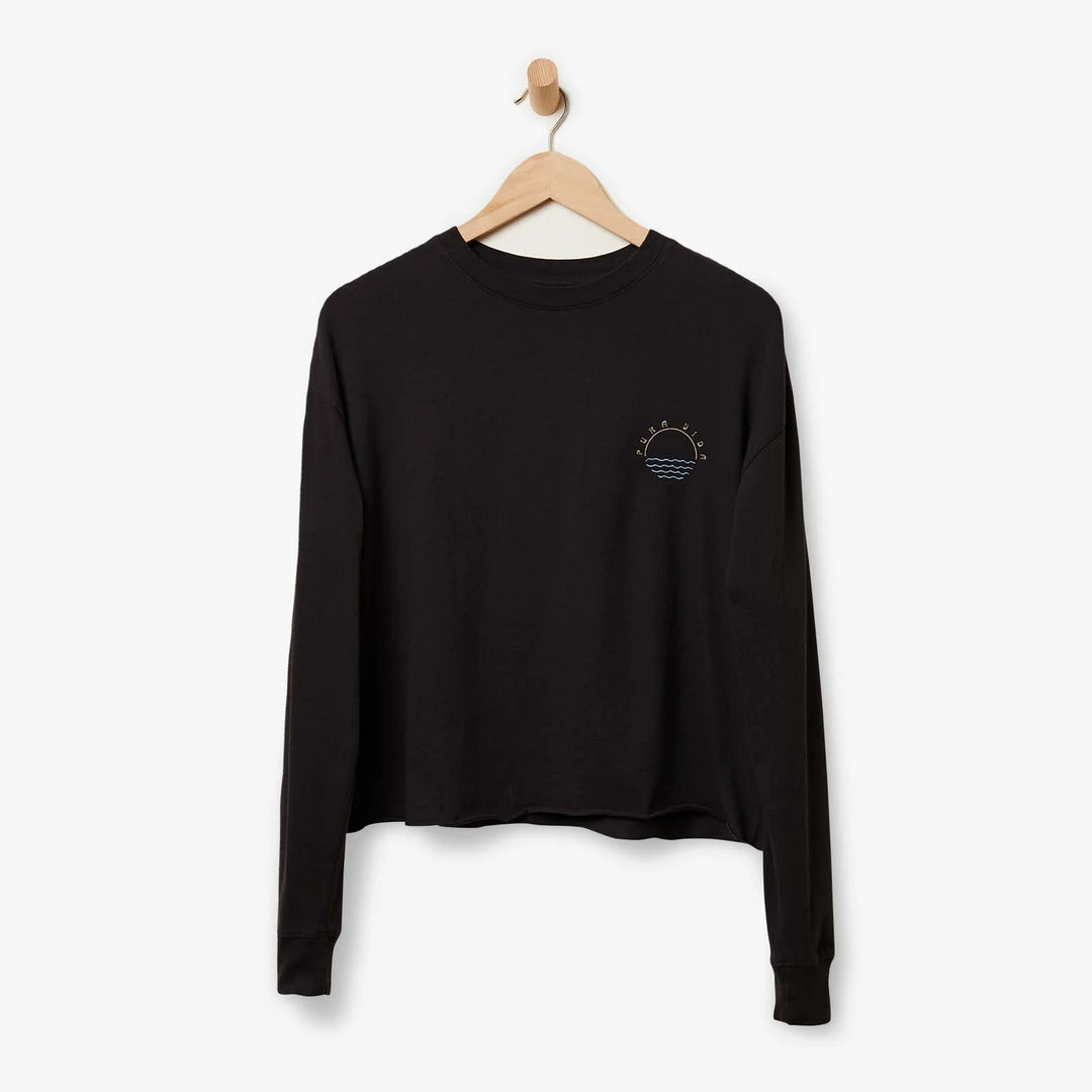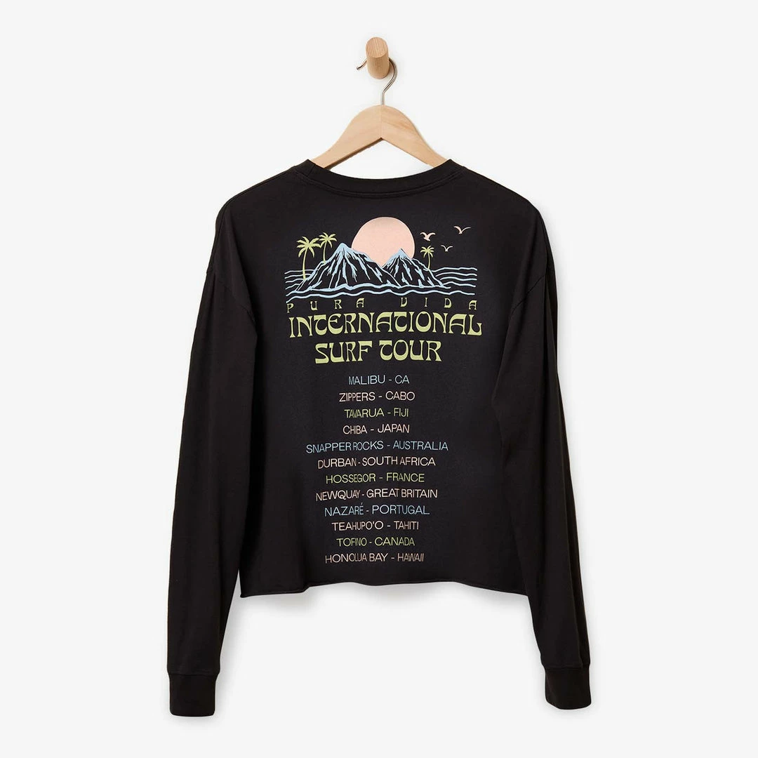 It doesnβt get more killer than our International Surf Tour Long Sleeve Boxy Tee. With a slightly slouchy and cropped fit, this classic black style features a a retro Pura Vida logo on the front and vintage-inspired tour graphic on the back.Β