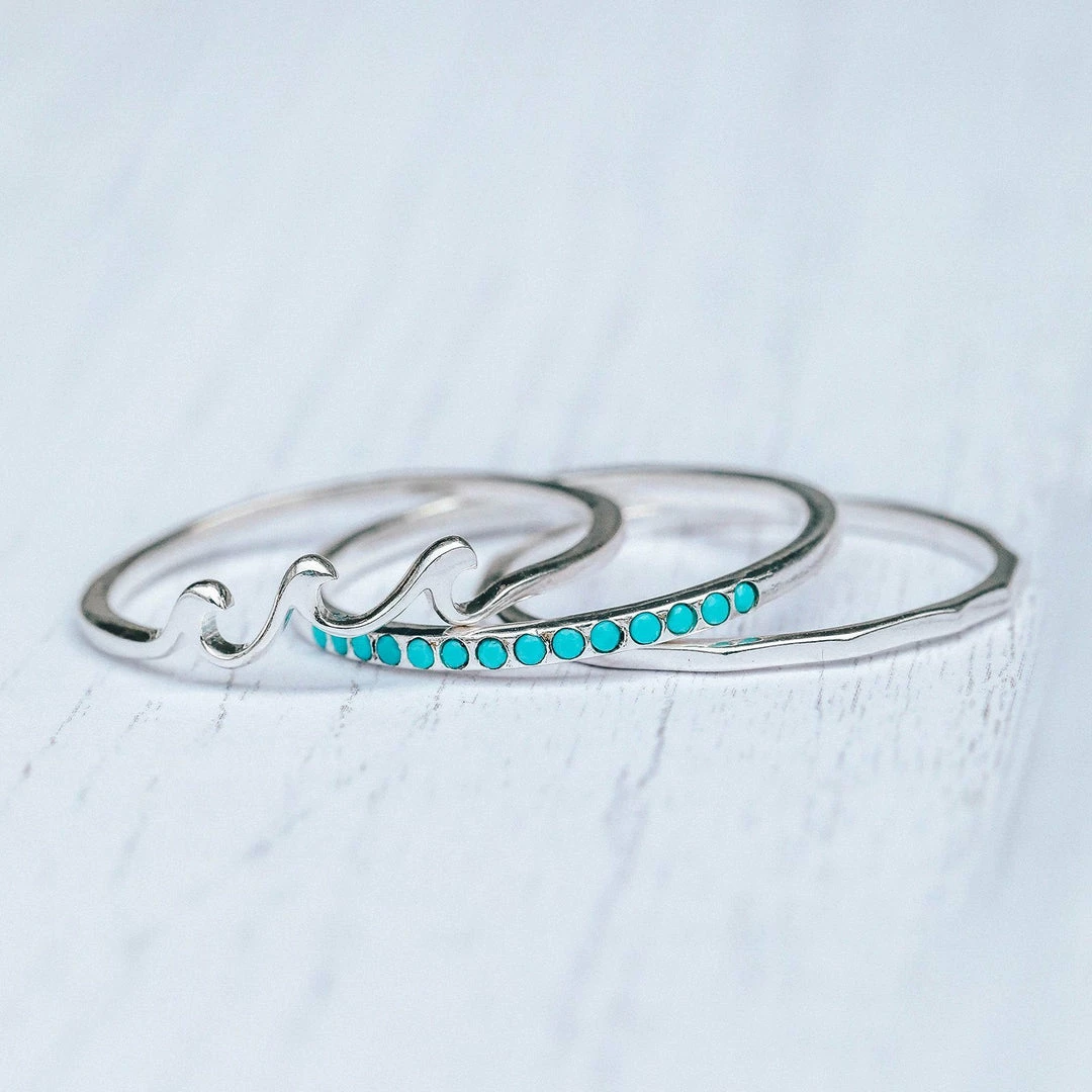 The only thing better than our best-selling Wave Ring? The sterling silver Wave Stack Set! Featuring (you guessed it!) the Silver Wave Ring, this three-piece pack also includes a simple silver band and turquoise zircon stones. Wear βem all together for the ultimate seaside style, or split βem up for something a little more low key.