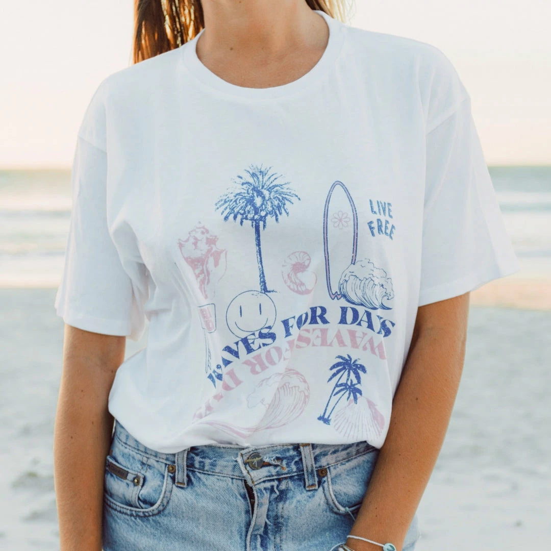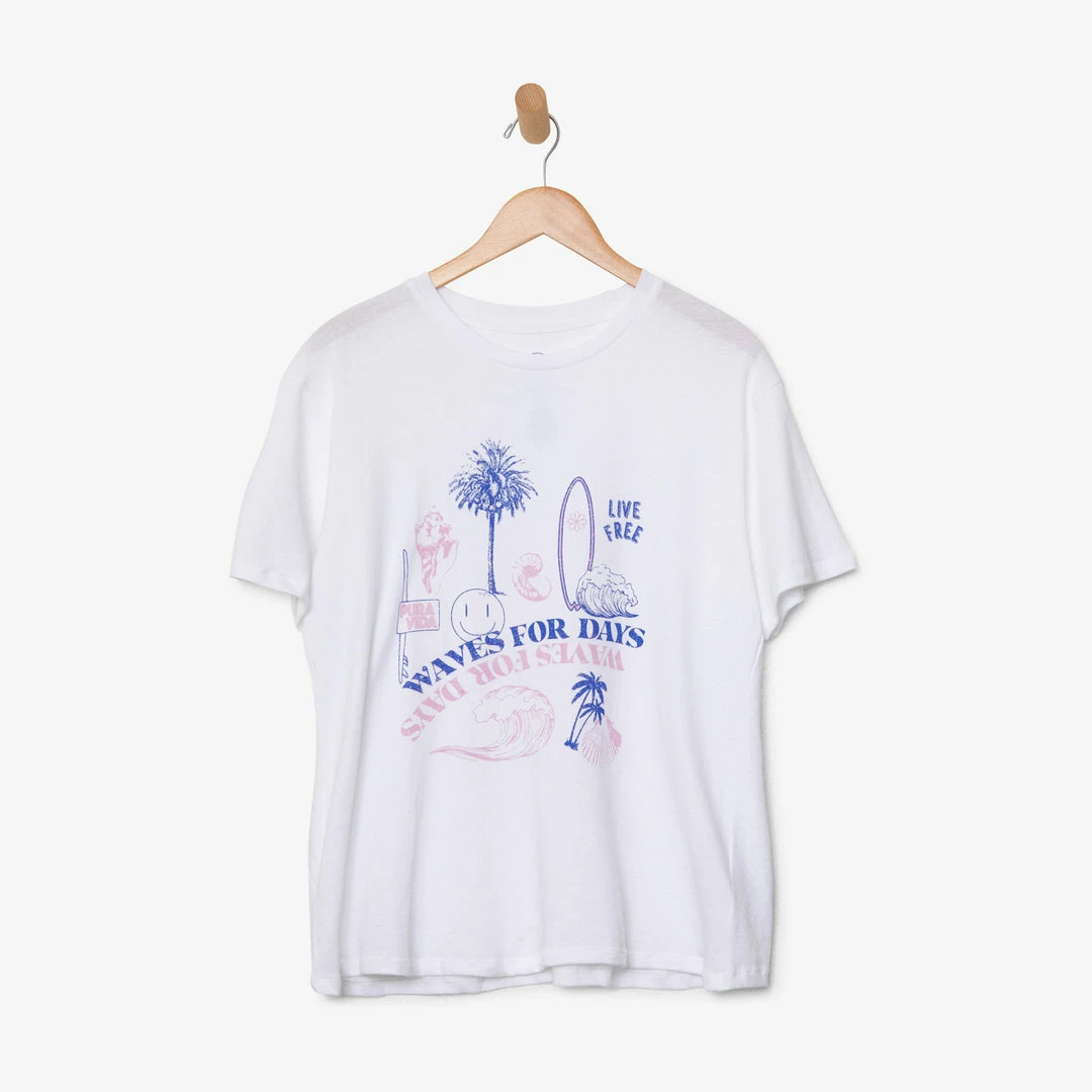 Every beach babe needs our Waves for Days Classic Crewneck Tee. With a split-hem design and relaxed fit, this graphic style is distressed for a vintage vibe.