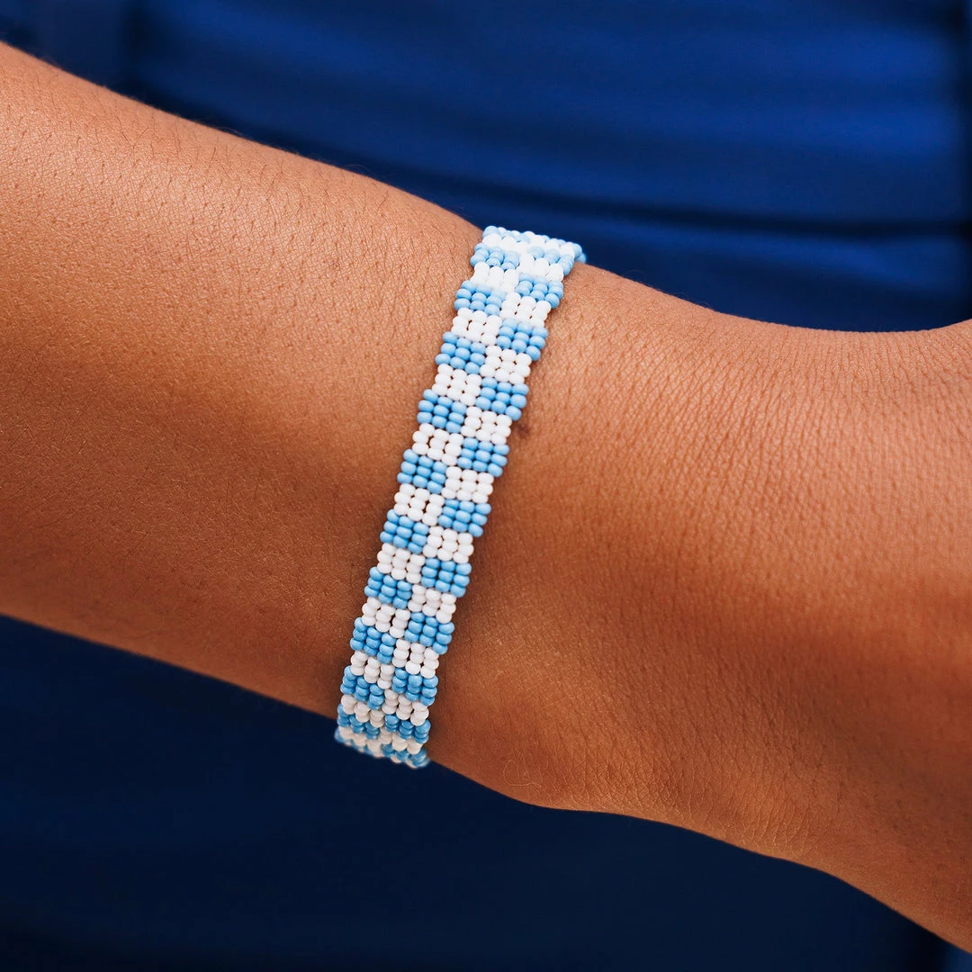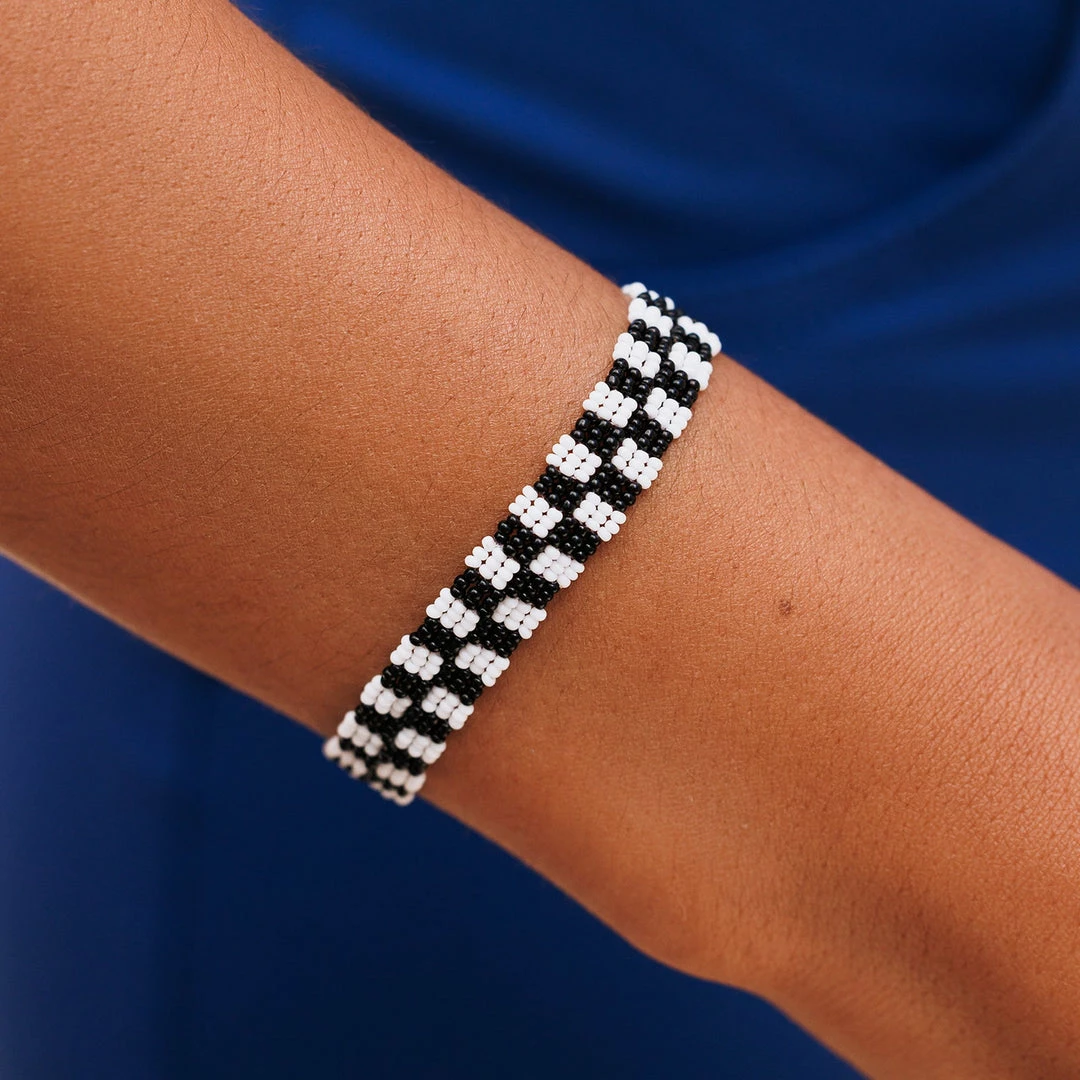 Get that effortless β60s style with our Woven Seed Bead Checkerboard Bracelet. Available in two bold color combosβthe classic black and white or baby blue and whiteβthis intricate seed bead style will be the highlight of any outfit.