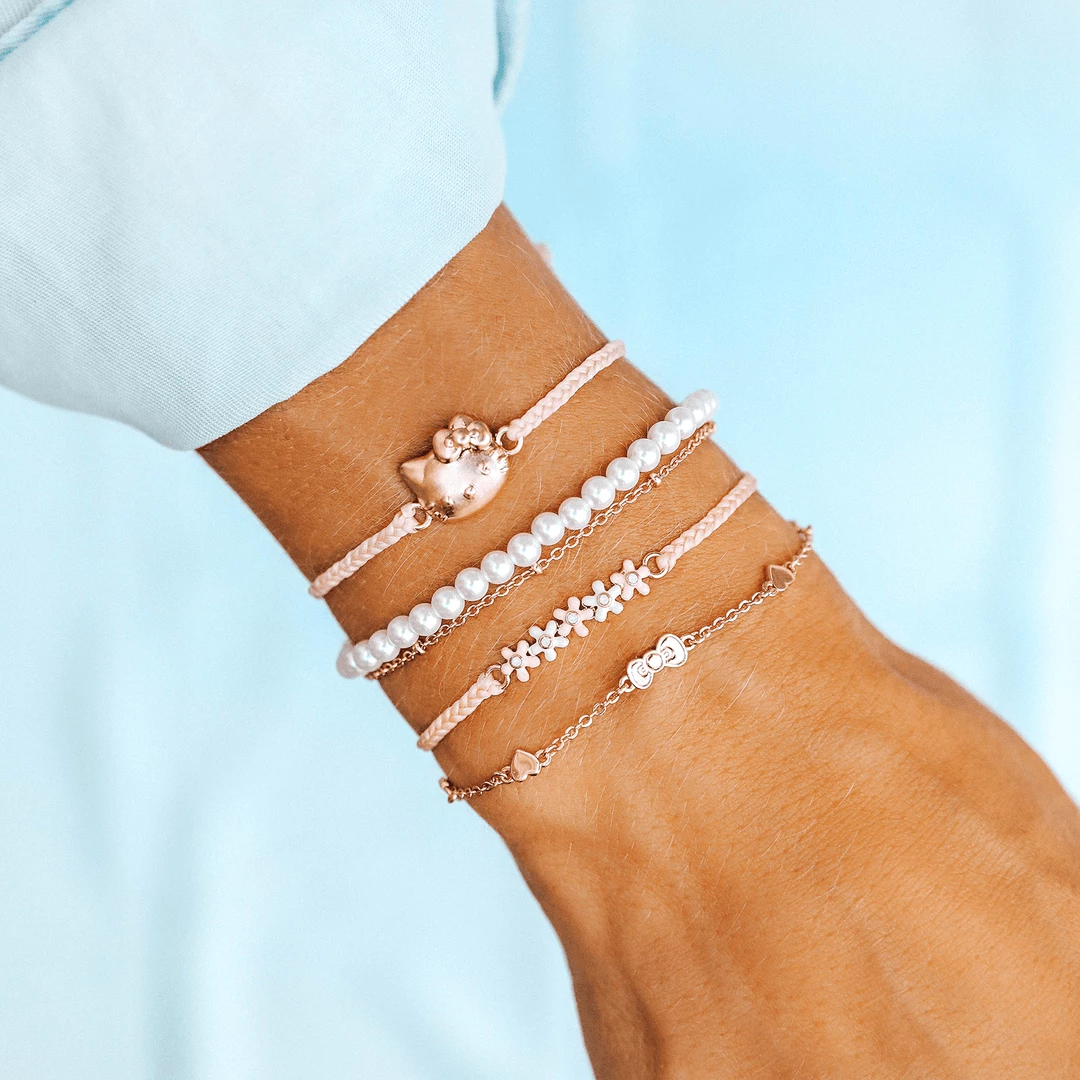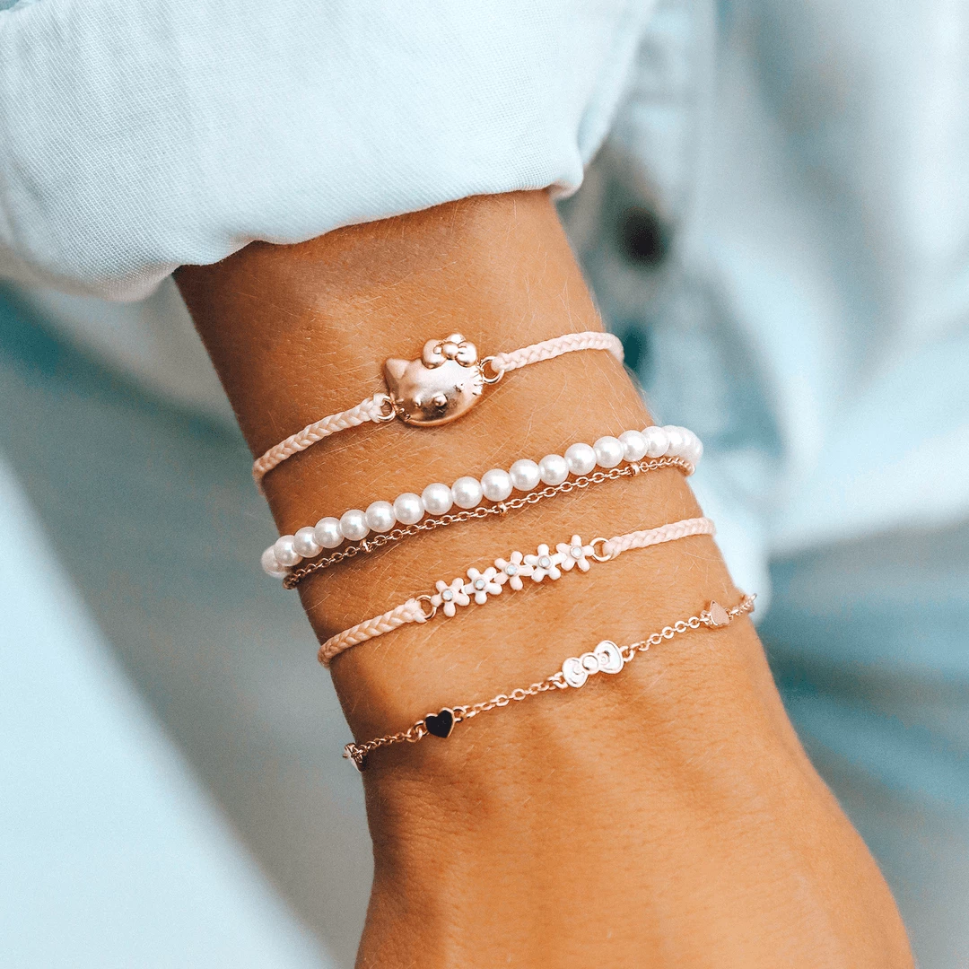 Looking for the perfect pack? Our Hello Kitty Style Pack is the one for you! Featuring four stackable or standalone styles, this set includes a bitty braid design with a rose gold Hello Kitty charm; a pearl and chain bracelet; an enamel flower charm style; and a metal bow and heart charm design. For each Sanrio style sold on our website, Pura Vida will donate 5% of the purchase price* to Kindness.org, a nonprofit organization dedicated to building a kinder world.