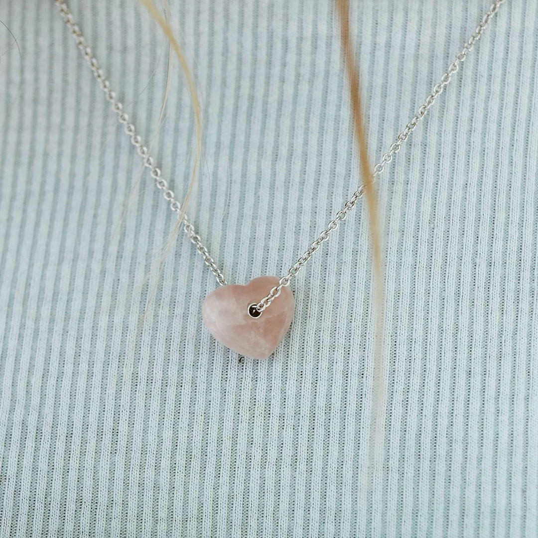 This necklace has our heart, literally.ย A genuine Rose Quartzย crystalย heart strung on an adjustable cable chain.ย Rose Quartz is known as the stone of love andย isย supposed to be worn close to the heart, it is believed to promote self-love and strong relationships.