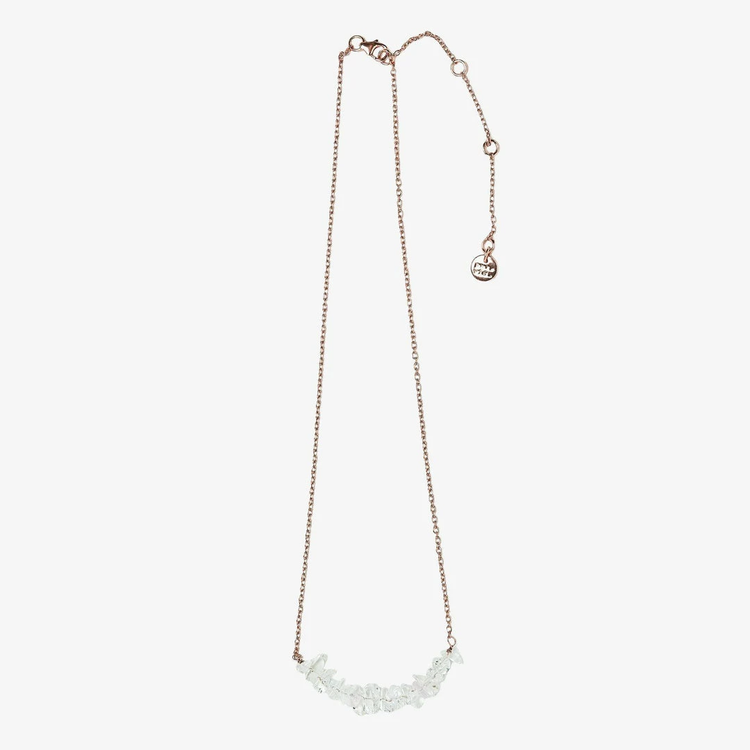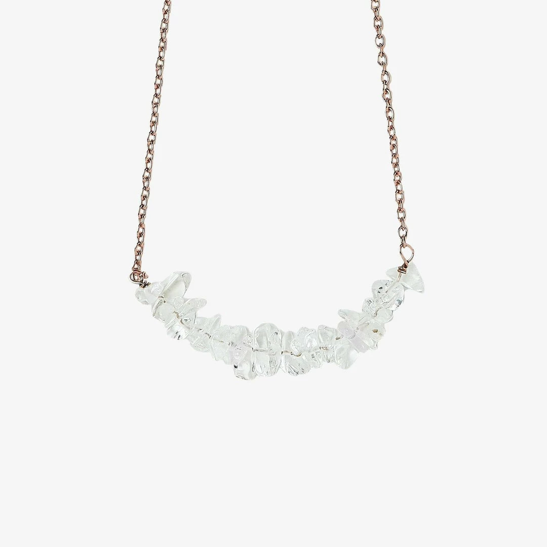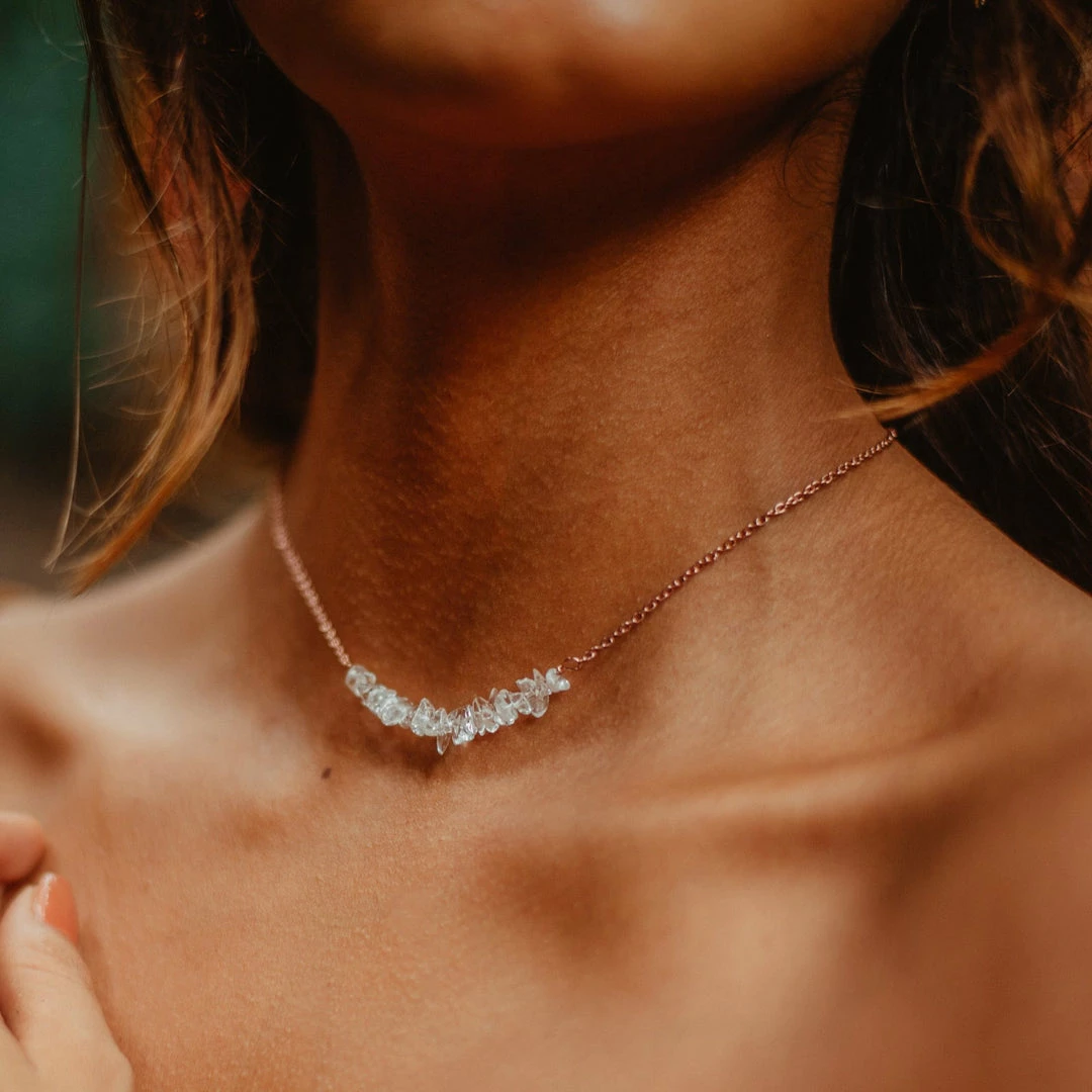 This luxe choker goes with *literally* everything! Clear quartz chips set on a shimmering rose gold chain make this piece perfect for day or night. Every stone is one-of-a-kind and believed to have allll the healing powers. The adjustable chain offers 3 length options for any neckline or season.