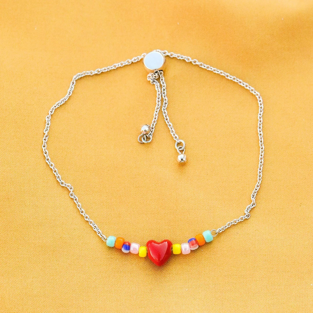 Everyone’s crushing on our Heart Slider Bracelet! This delicate silver style features colorful seed beads and an enameled heart charm, with a slider design for a fully customizable fit.