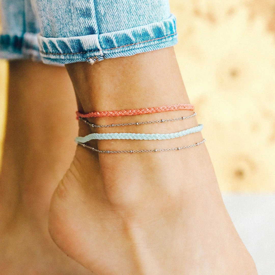 Our Satellite Chain Anklet is simply the best. This minimal-but-majorly-cool design comes in two metal finishes and four string hues, with a classic braided band and dainty satellite chain.